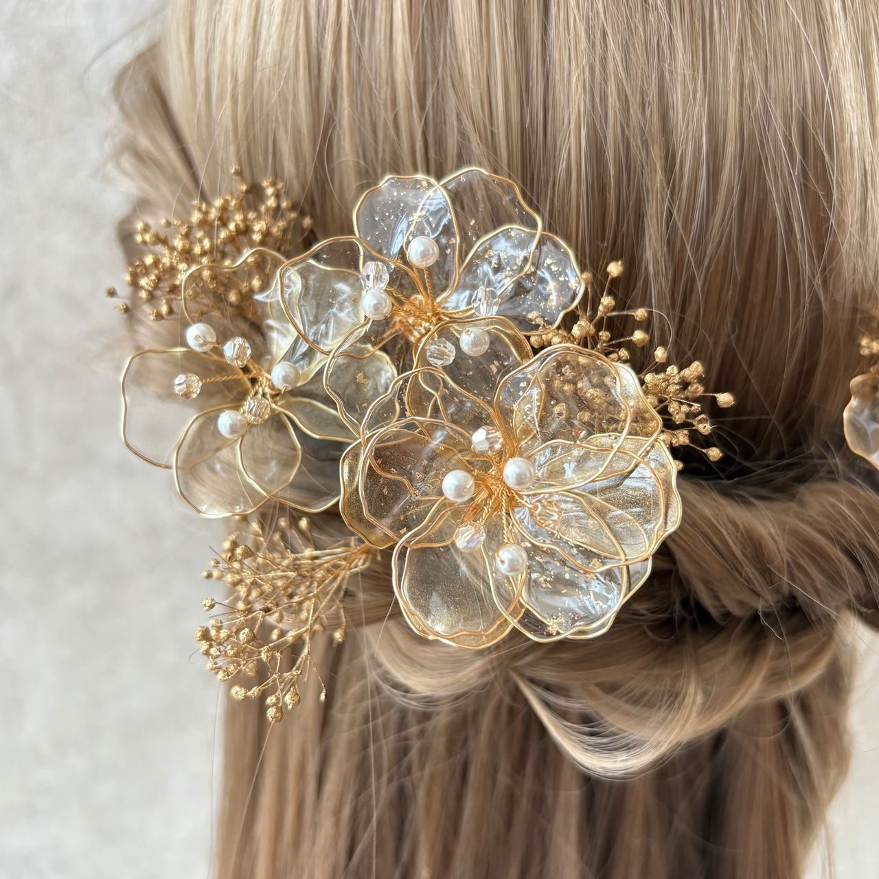 天使の羽がそっと舞い降りたような、透明感溢れる、ガラスのように繊細な髪飾りは、花嫁様の上品な美しさを引き立たせます。