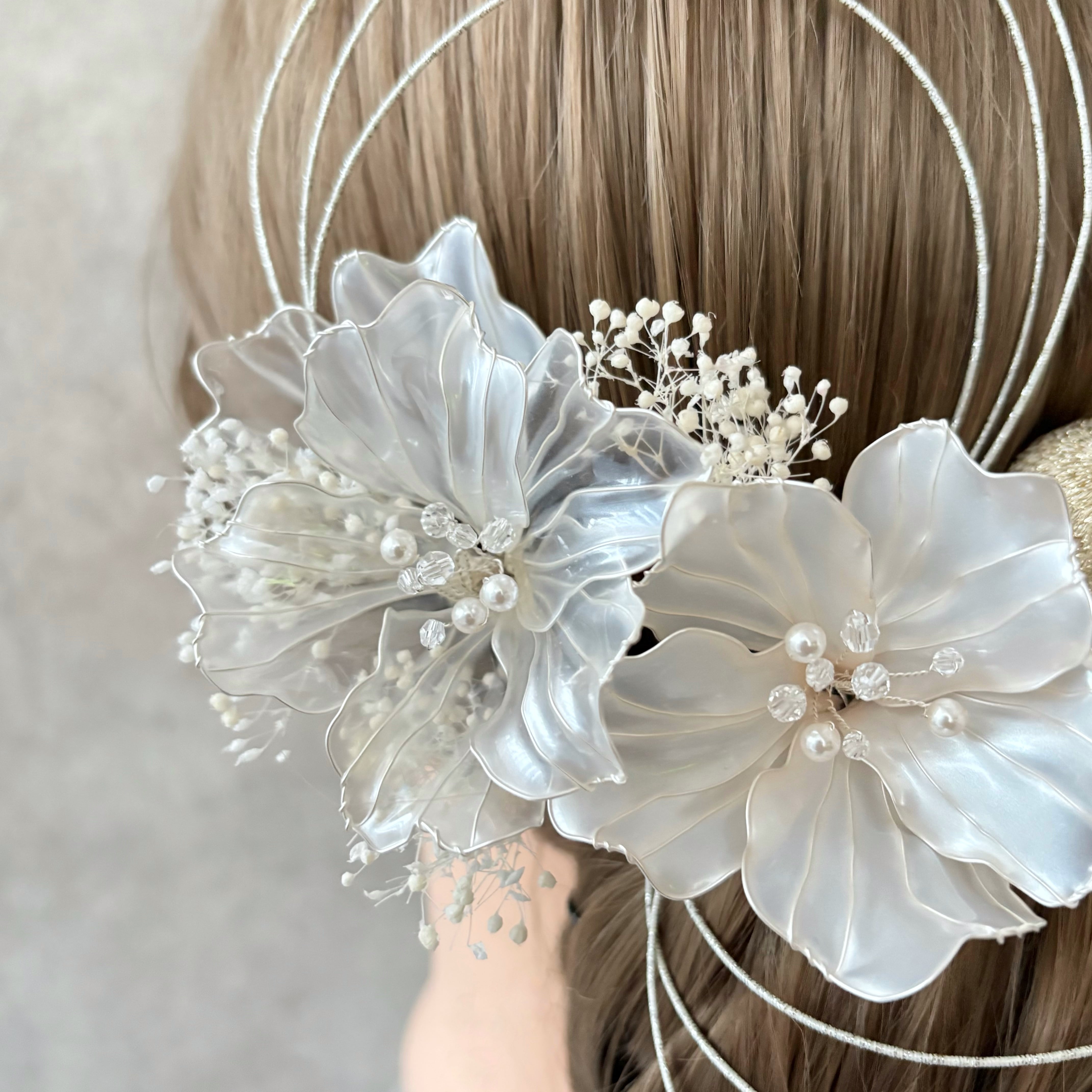 天使の羽がそっと舞い降りたような、透明感溢れる、ガラスのように繊細な髪飾りは、花嫁様の上品な美しさを引き立たせます。