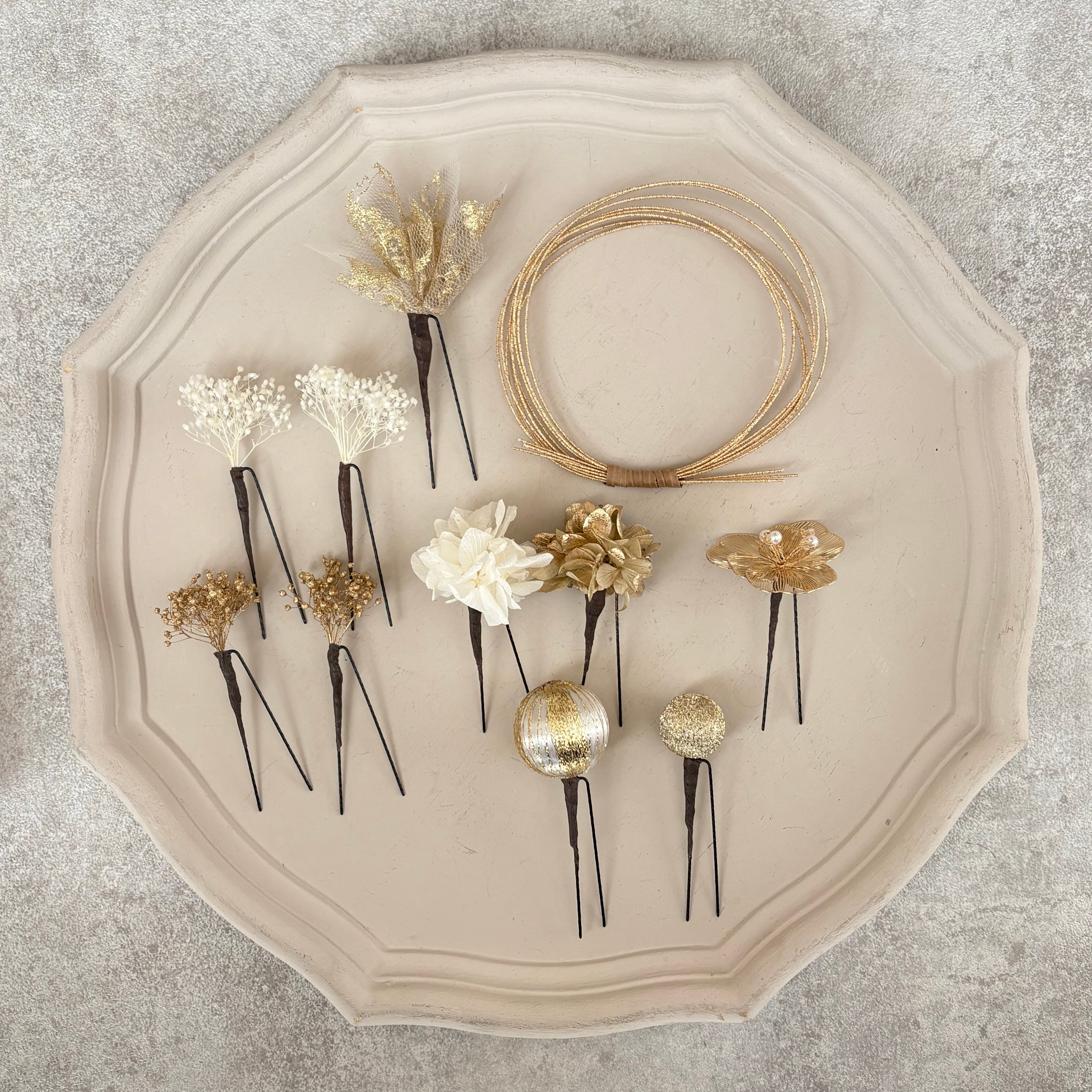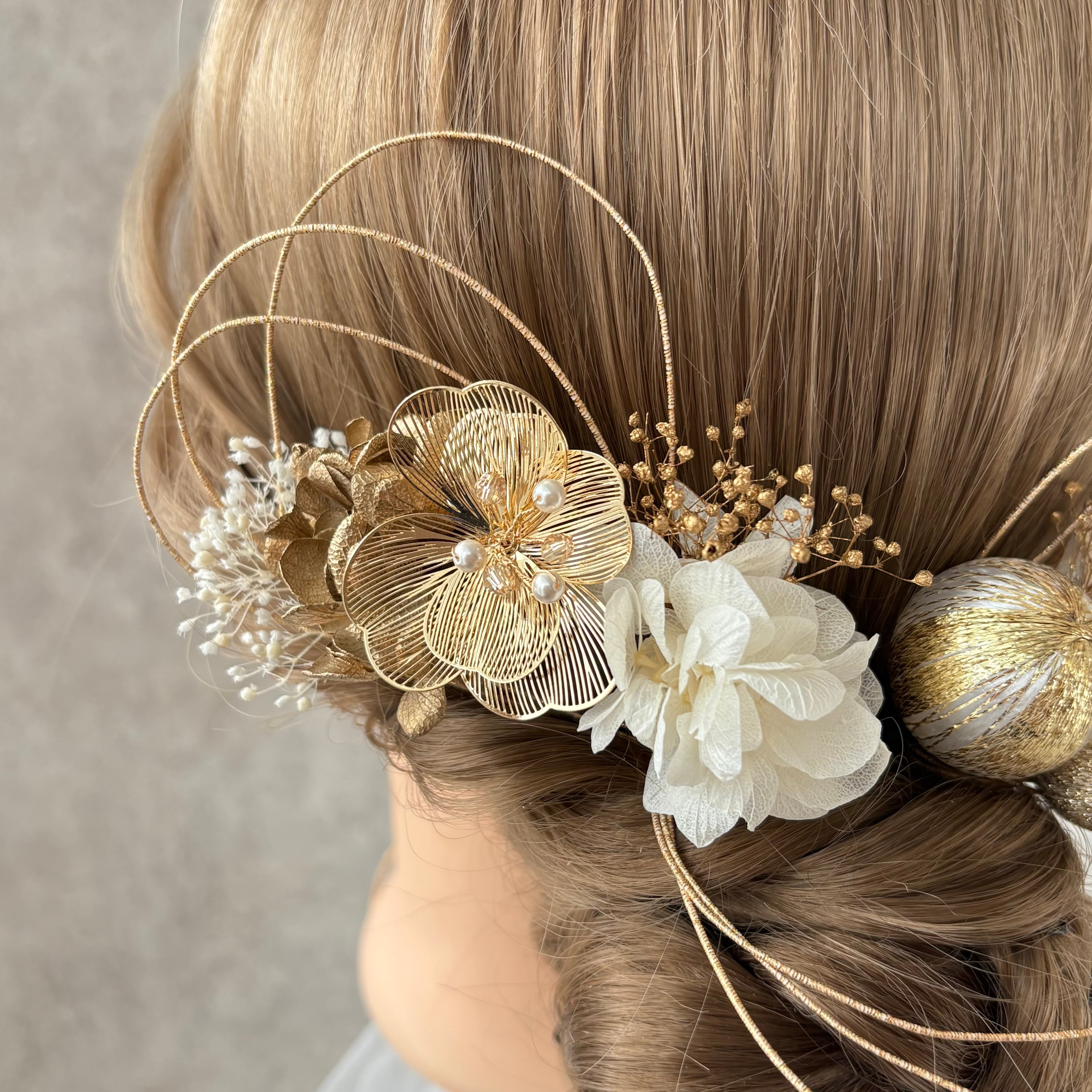 光を受けて上品に輝く、ゴールドのメタルフラワーに、和玉や水引をあしらい、モダンな雰囲気を兼ね備えたデザインは晴れの日を優雅に彩る、華やかな髪飾りです。